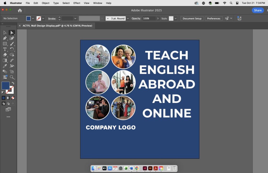 For English Language Programs’ presence at ACTFL 2025 in New Orleans, Louisiana (November 21–23), the program purchased a 10 × 10 ft tension fabric wall display for its booth. The Georgetown University (GU) outreach team collaborated on the initial design concepts using Canva, which were then reviewed and approved by U.S. Department of State Global Program Officers. I recreated the final approved design in Adobe Illustrator, ensuring it met all vector, color, and high-resolution printing specifications required by the vendor.